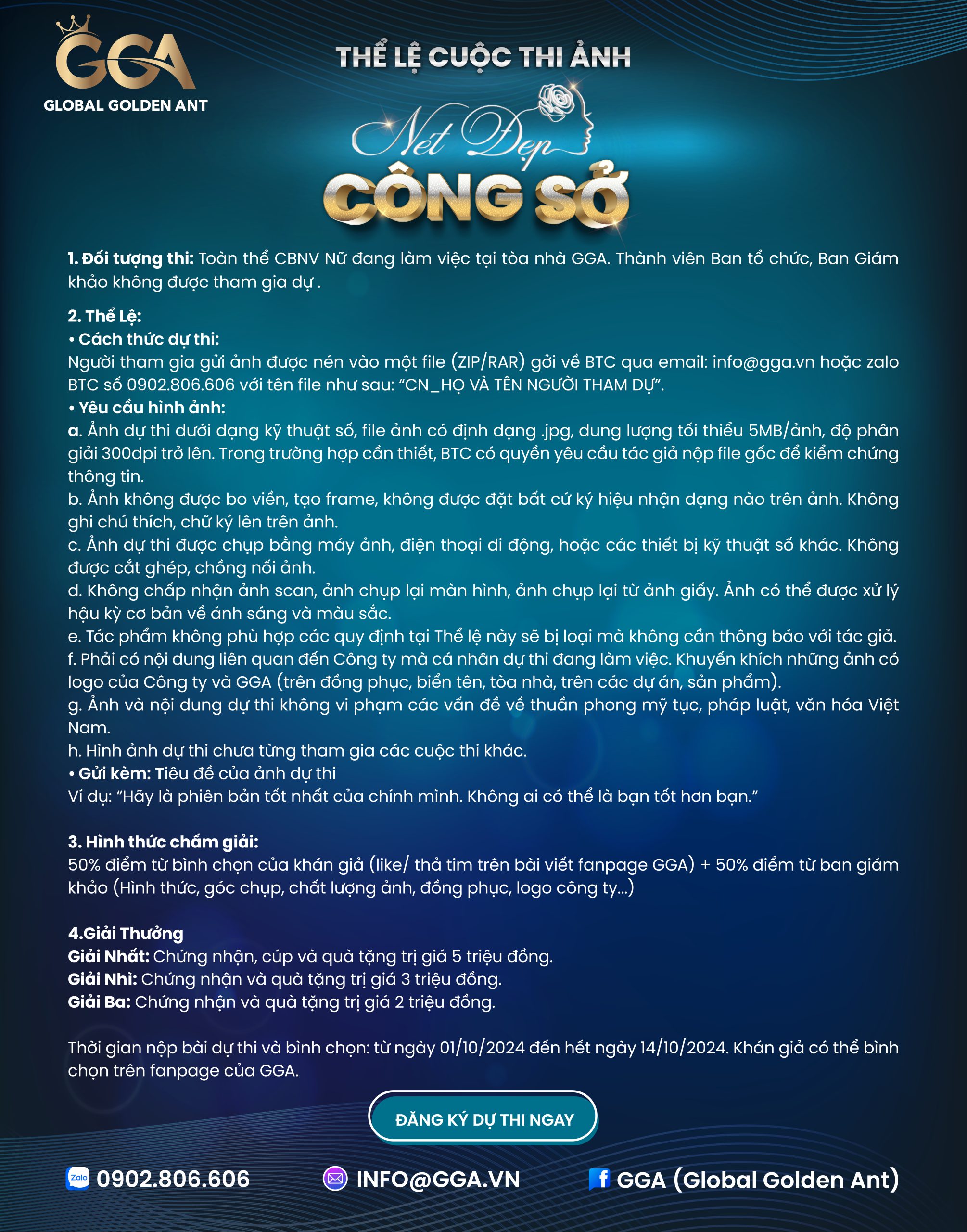 Nhằm tôn vinh những phẩm chất đáng quý này, công ty Kiến Vàng Toàn Cầu GGA tổ chức cuộc thi ảnh “Nét Đẹp Công Sở” dành cho các cán bộ nhân viên nữ thuộc các công ty trong tòa nhà GGA. Cuộc thi không chỉ tạo cơ hội để các chị em thể hiện phong cách cá nhân, mà còn khuyến khích sự kết nối và giao lưu nét văn hoá đặc trưng giữa các công ty, đồng thời cũng thể hiện sự quan tâm đến cộng đồng khách hàng của GGA.